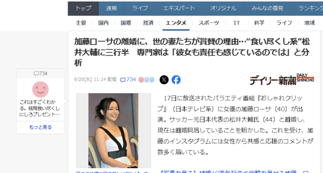 引用ページ(Yahoo!ニュースより):加藤ローサの離婚に世の妻たちが賞賛の理由ーデイリー新潮